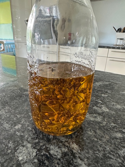 In meiner kleinen Bibliothek blättere ich mich durch die Bücher und entdecke: Rainfarn wird bei Burnout empfohlen. Ist giftig. Wird nur äusserlich angewendet. Ich erkundige mich bei meiner HK-Freundin nach einem guten Öl für einen Auszug und ich bestelle Distelöl. Ein paar trockene Dolden wandern in die Flasche und es sieht aus wie eingefangenes Sonnenlicht. Wirklich schön. Zu Rainfarn hatte in der Weiterbildung Lucina eine Assoziation, lese ich in meinen Notizen: Das ist ja wie bei Frederick! Die Maus, die nicht fleissig war wie die anderen, sondern anders. Und die letzte Phase der Winterdunkelheit ohne Essen und Trinken im Mäusebau mit den Vorräten an Farben, Sonnenstrahlen und guten Worten überbrückt. Ja, das passt.